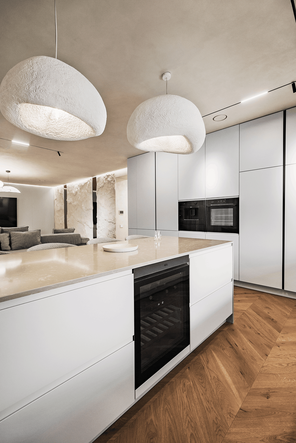 Designul pune accent pe echilibru vizual și funcționalitate, integrând perfect spațiul de gătit cu zona de zi. Corpurile minimaliste creează o estetică uniformă, iar masa centrală masivă devine punctul de atracție al încăperii. Întregul proiect transmite senzația de ordine, luminozitate și eleganță discretă.