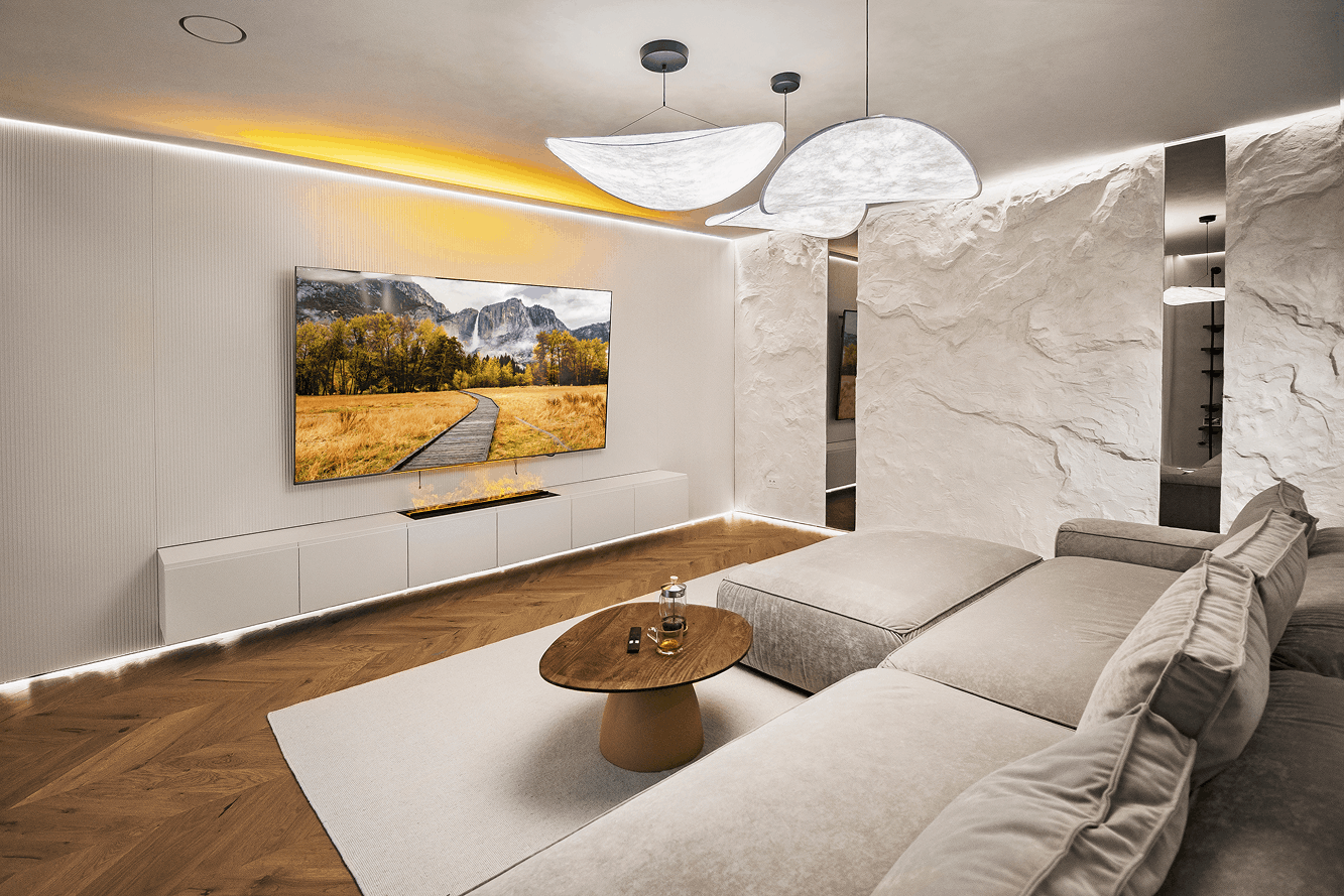 Penthouse amenajat complet cu mobilier realizat la comandă, într-un stil modern și coerent. Openspace-ul living–bucătărie este definit de finisaje calde, piatră, riflaj și linii minimaliste, cu mobilier custom gândit pentru proporții perfecte și funcționalitate.